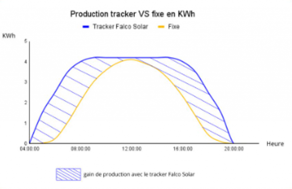 C’est là que nos trackers solaires sont décisifs : ils ajustent en continu leur orientation pour suivre le mouvement du soleil tout au long de la journée. Contrairement aux installations fixes, dont la production maximale se concentre souvent autour de midi, nos trackers permettent de produire de l’électricité tout au long de la journée, exactement au moment où le site en a besoin. Cette adaptation dynamique maximise l’autoconsommation, réduit la dépendance au réseau et garantit que l’énergie produite est utilisée de manière optimale. En d’autres termes, nos trackers ne se contentent pas d’augmenter la production globale, ils la répartissent intelligemment pour correspondre aux besoins réels du site, offrant ainsi une production photovoltaïque efficace et continue.
