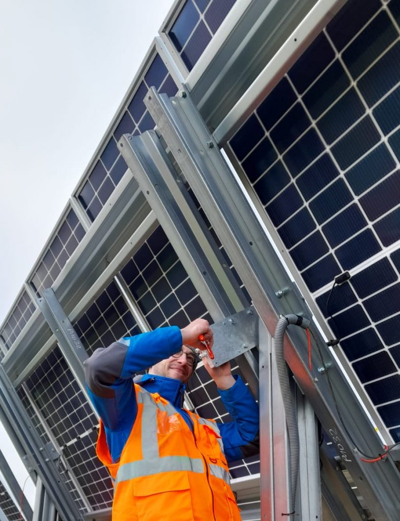 Une surface optimisée : Pour 37 kWc de puissance, l’emprise au sol totale est inférieure à 400 m², avec seulement 24 pieds ancrés dans le sol. Le surplus de production lié au tracker permet notamment de minimiser cette emprise au sol